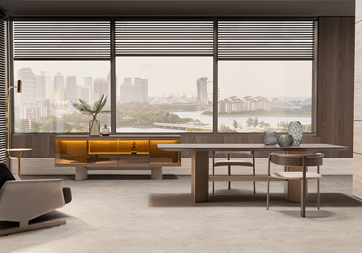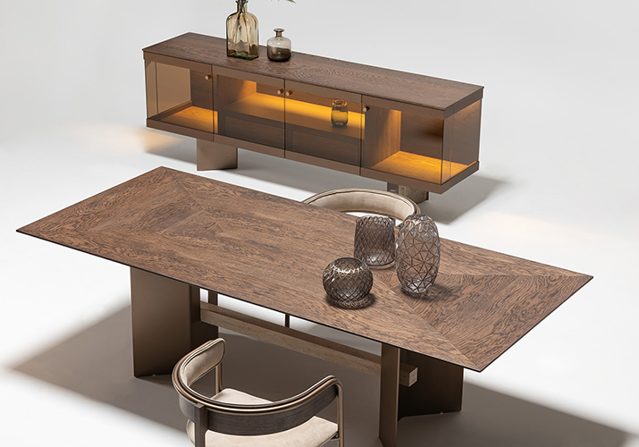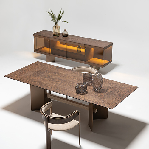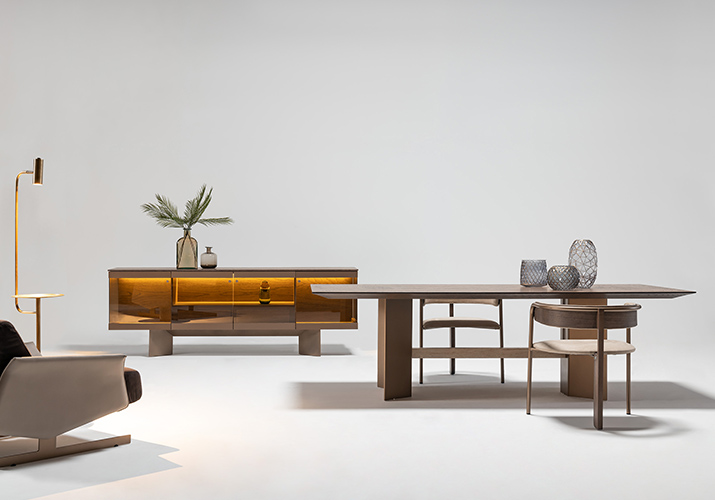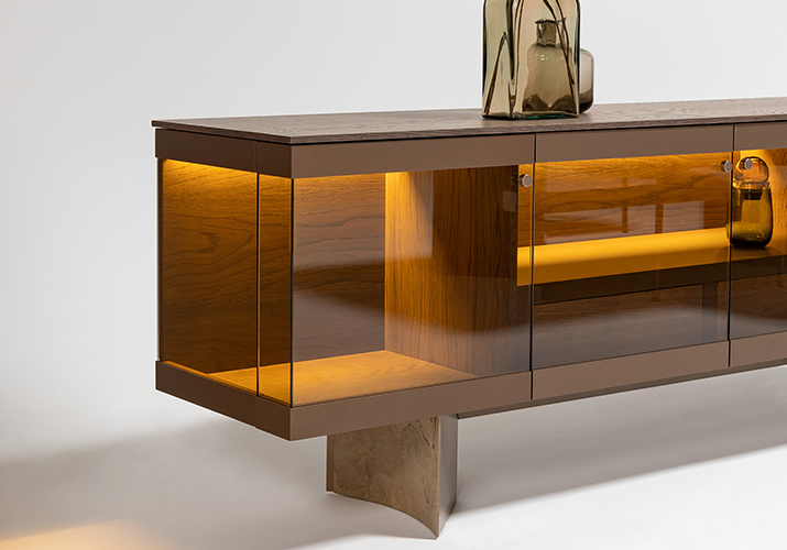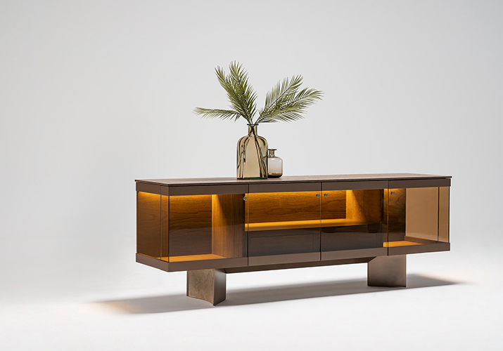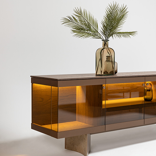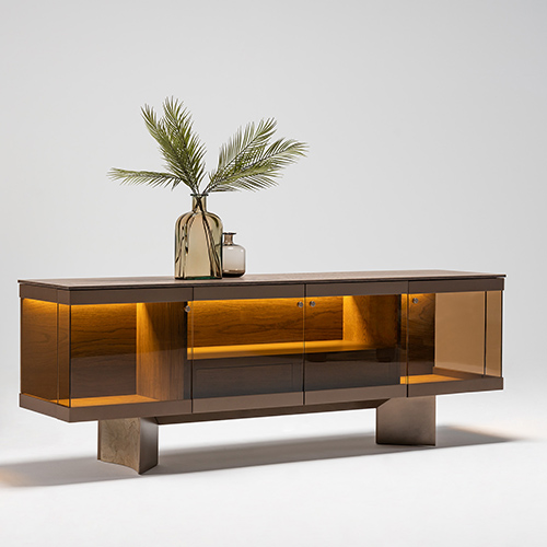 Complementing its very light and transparent appearance with special bronze painted metal legs, Massential Console reveals this transparent appearance with all its splendor by the special Led light leach behind it.